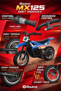 Few names in the electric ride-on world carry as much recognition as Razor. From kick scooters to electric skateboards, the brand has built a reputation for accessible, entry-level performance products. The Razor MX125 Dirt Rocket continues that tradition — offering young riders their first real taste of motocross-inspired riding in a compact, electric-powered package.