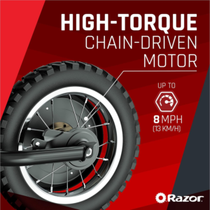 The Razor MX125 Dirt Rocket is a chain-driven, electric-powered mini dirt bike designed for younger riders. It features authentic motocross styling, knobby tires, and a scaled-down frame that gives kids the feel of riding a real dirt bike — without the complexity of gas engines.