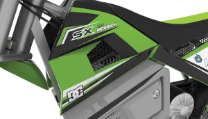 Both bikes cap at 14 mph, but the SX350 is lighter and styled around Jeremy McGrath’s MX legacy — offering a cooler look for younger riders